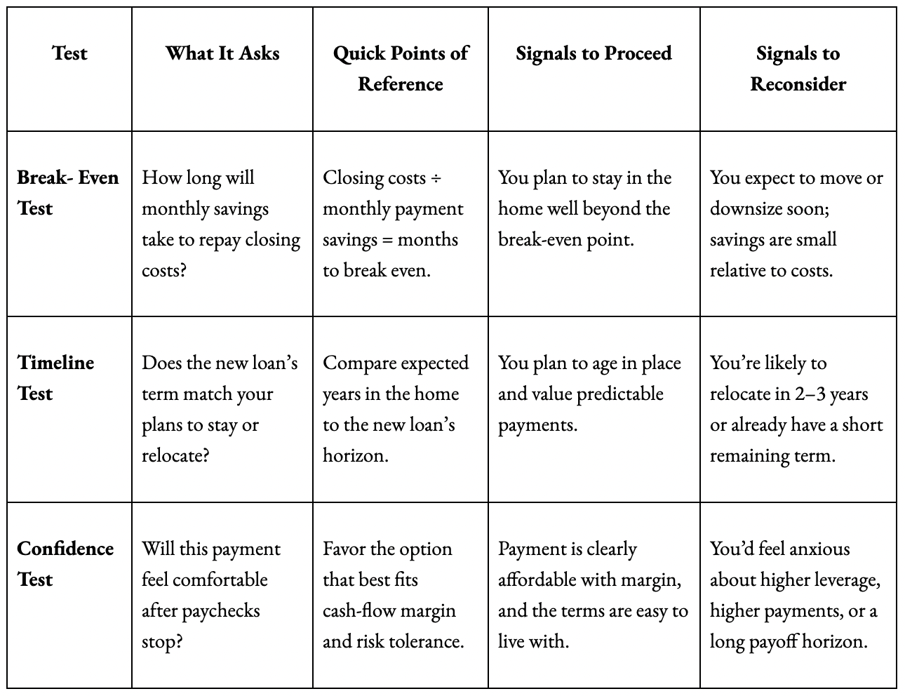 Home refinancing decisions before retirement often come down to balancing competing priorities. What improves one area, such as monthly cash flow, can add strain elsewhere, like long-term costs or flexibility. Understanding how these three factors work together can help you choose the option that best matches your goals and comfort level.